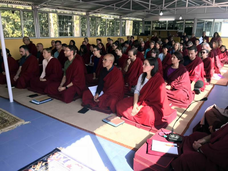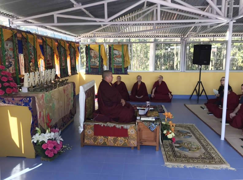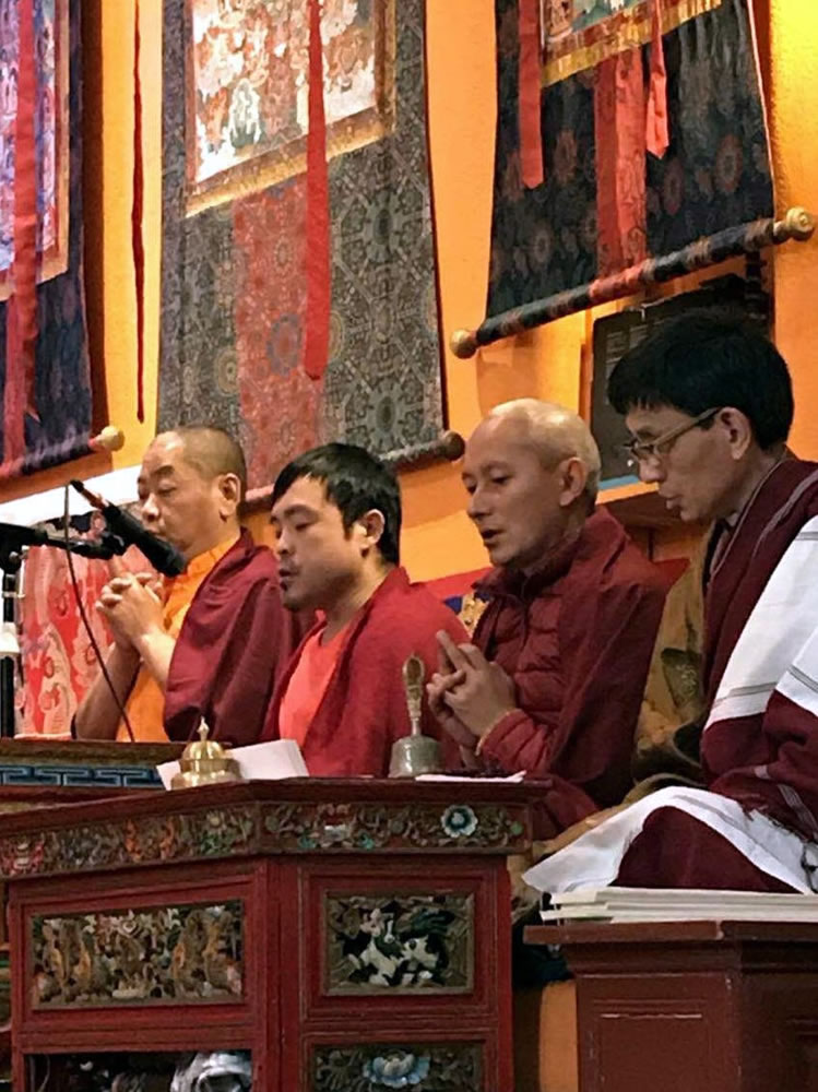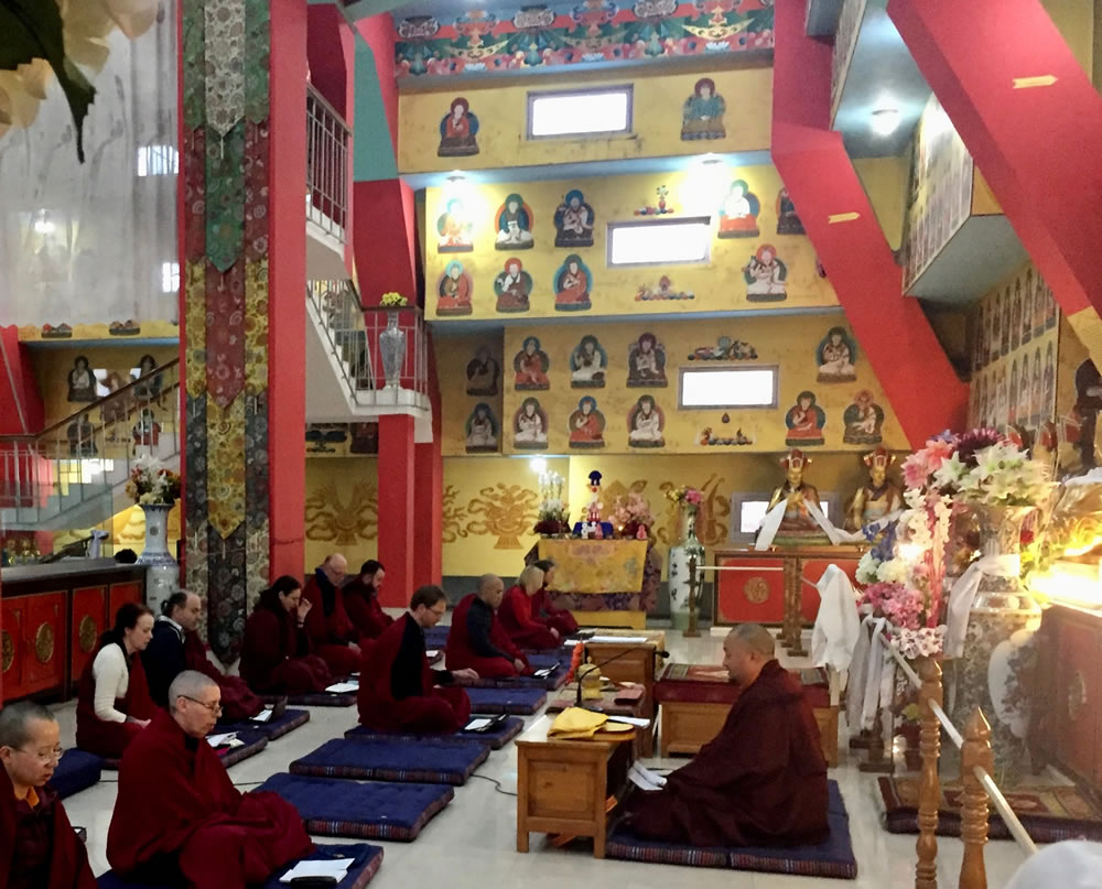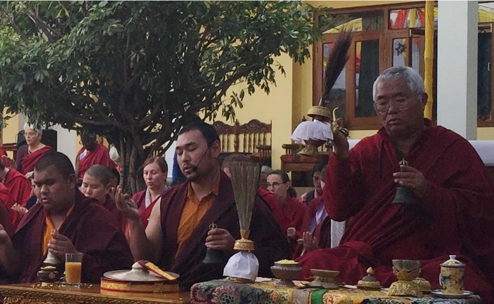 During phase one of the retreat, Jetsün Khandro Rinpoche generously bestowed numerous profound teachings on the Path of Meditation in the three yanas. Venerable Thinley Gyaltsen, Venerable Sonam la and Anila Tsultrim Dechen led morning and evening sessions of group practice. Sangha members spent the day circumambulating the Great Stupa, receiving teachings, practicing individual sessions and meditating in the beautiful lineage shrine room of the Great Stupa. Intensive classes in reading traditional Tibetan texts and ritual practice were held under the careful guidance of the senior monks of Mindrolling with a select group of Mindrolling international sangha members training under the watchful eye of Ven. Thinley Gyaltsen and Ven. Sonam Topgyal la.