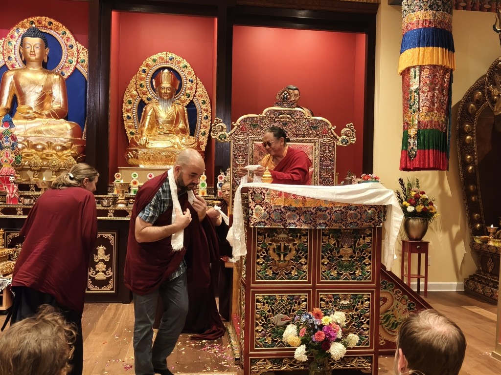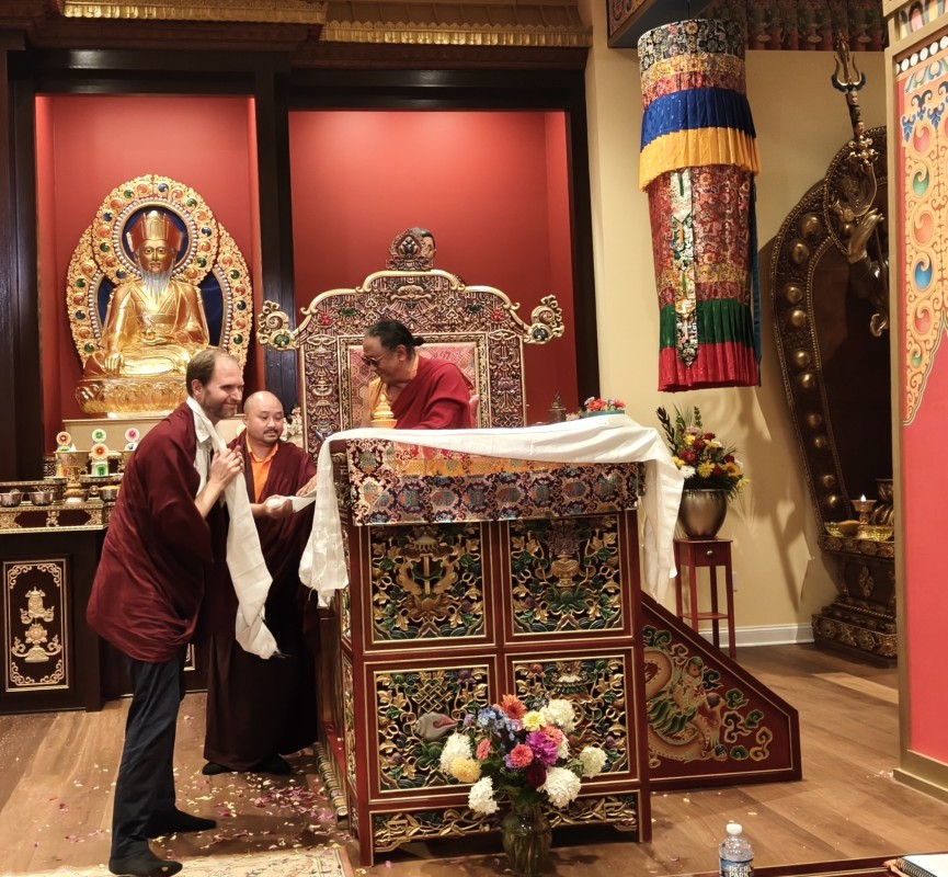 In the summer of 2025 at Mindrolling Lotus Garden, the long-awaited consecration of the newly built temple, Mindrol Gatsal, took place. Mindrolling Lotus Garden sangha members gathered from around the world to take part in this wonderful occasion. The process began with the elaborate po chog, the ritual for transferring the sacred contents, blessings, and siddhis from the old shrine room to the new temple. The po chog was held on the 16th of August, 2025. The ritual centers around the melong, or mirror, that serves as the physical support to gather the jnanasattvas and their blessings that the old shrine room has been imbued with over years of practice, studies, teachings, and transmissions. The melong is then covered in cloth in the colors of the Five Buddha Families and brought in a ceremonial procession from the old temple into the new temple.