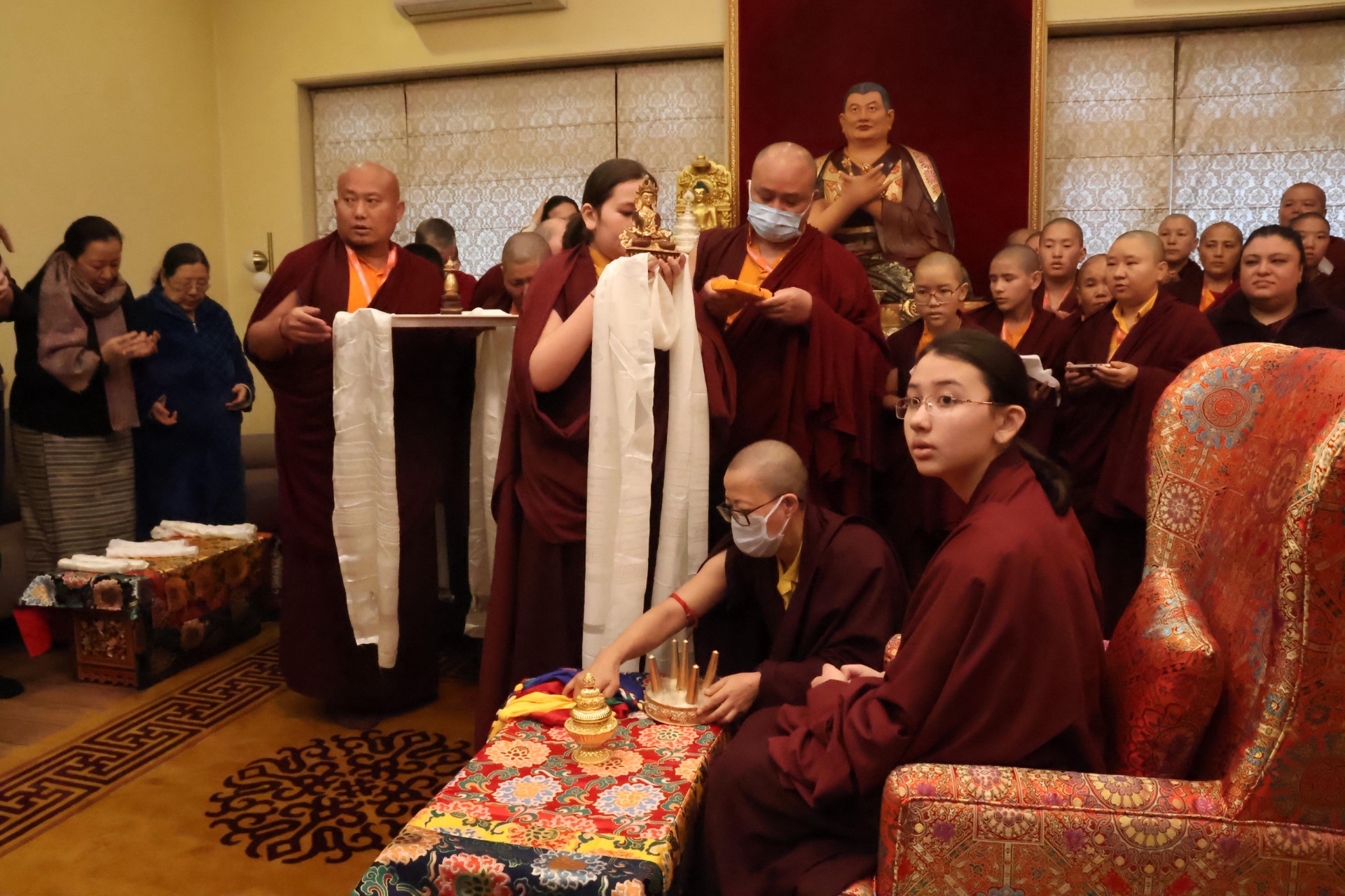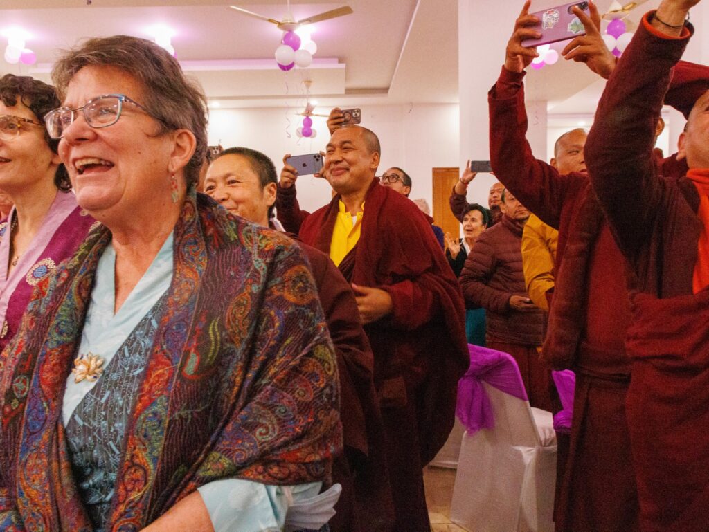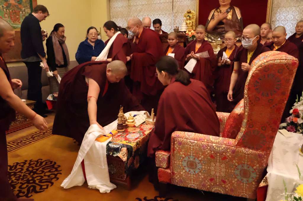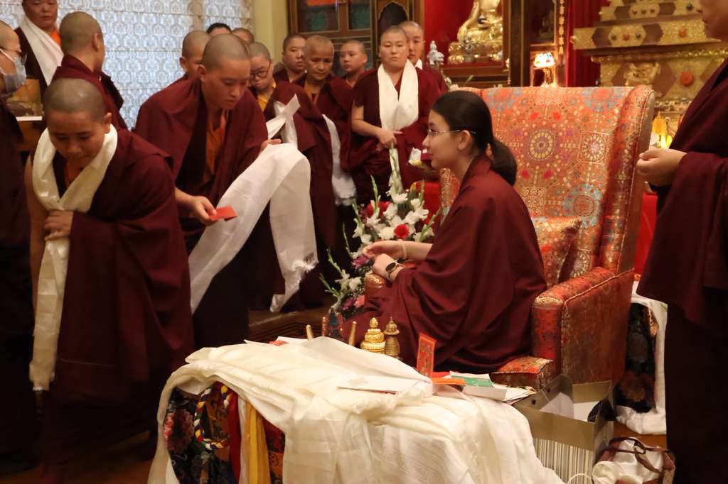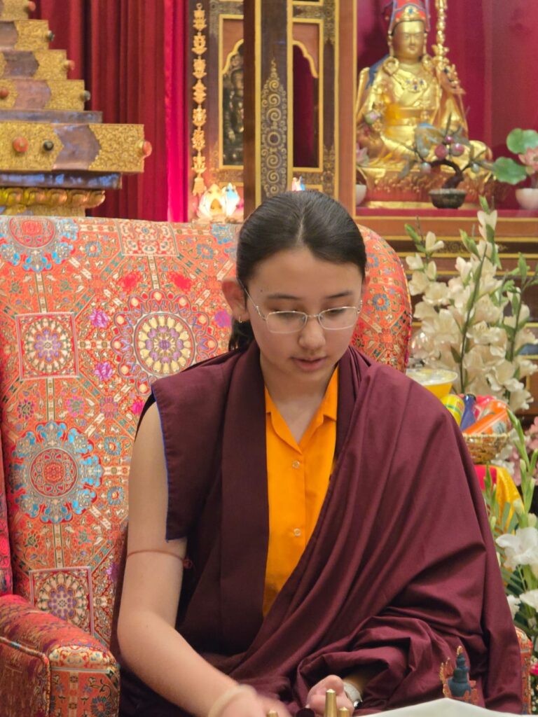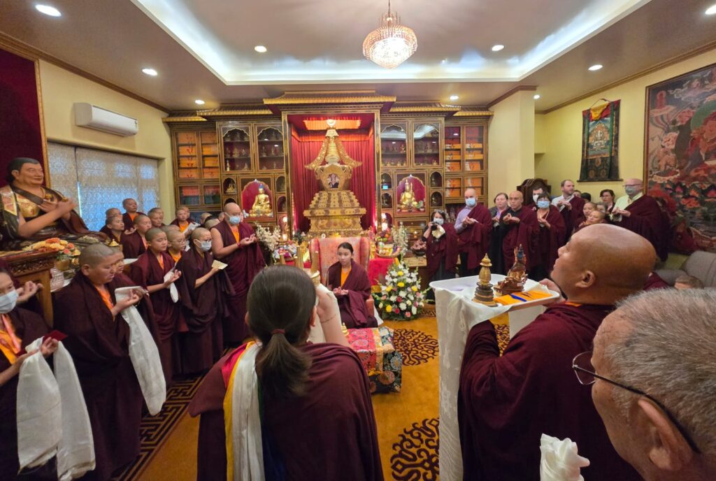 On December 15th, 2025, the Mindrolling International sangha celebrated the birthday of Minling Jetsün Rinpoche. Minling Dungse Rinpoche led the Mindrolling Ladrang, including Minling Jetsün Khandro Rinpoche, Minling Jetsün Dechen Paldrön, Sangyum Kushog, and Britton la, along with the assembly of Mindrolling Monks, Samten Tse nuns, and Mindrolling International sangha members in offering a vast mandala and body, speech, and mind to Jetsün Rinpoche. The gathered assembly made heartfelt aspirations and dedications for Jetsün Rinpoche’s long life and vast activities.
