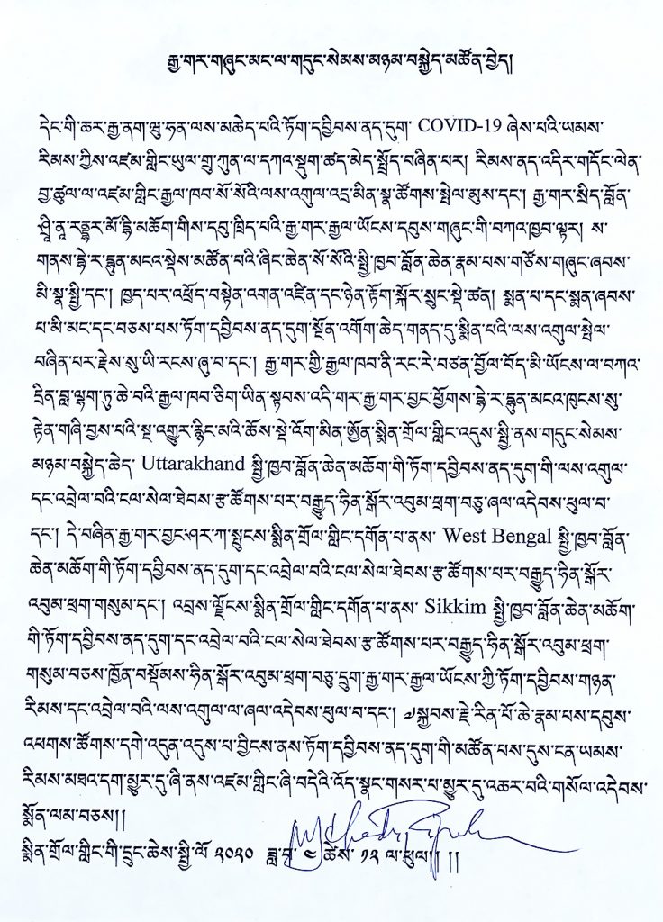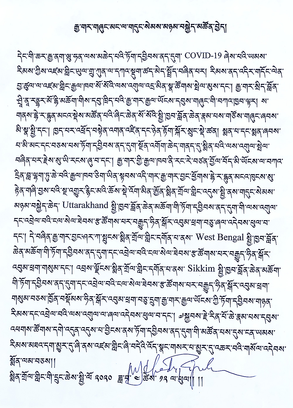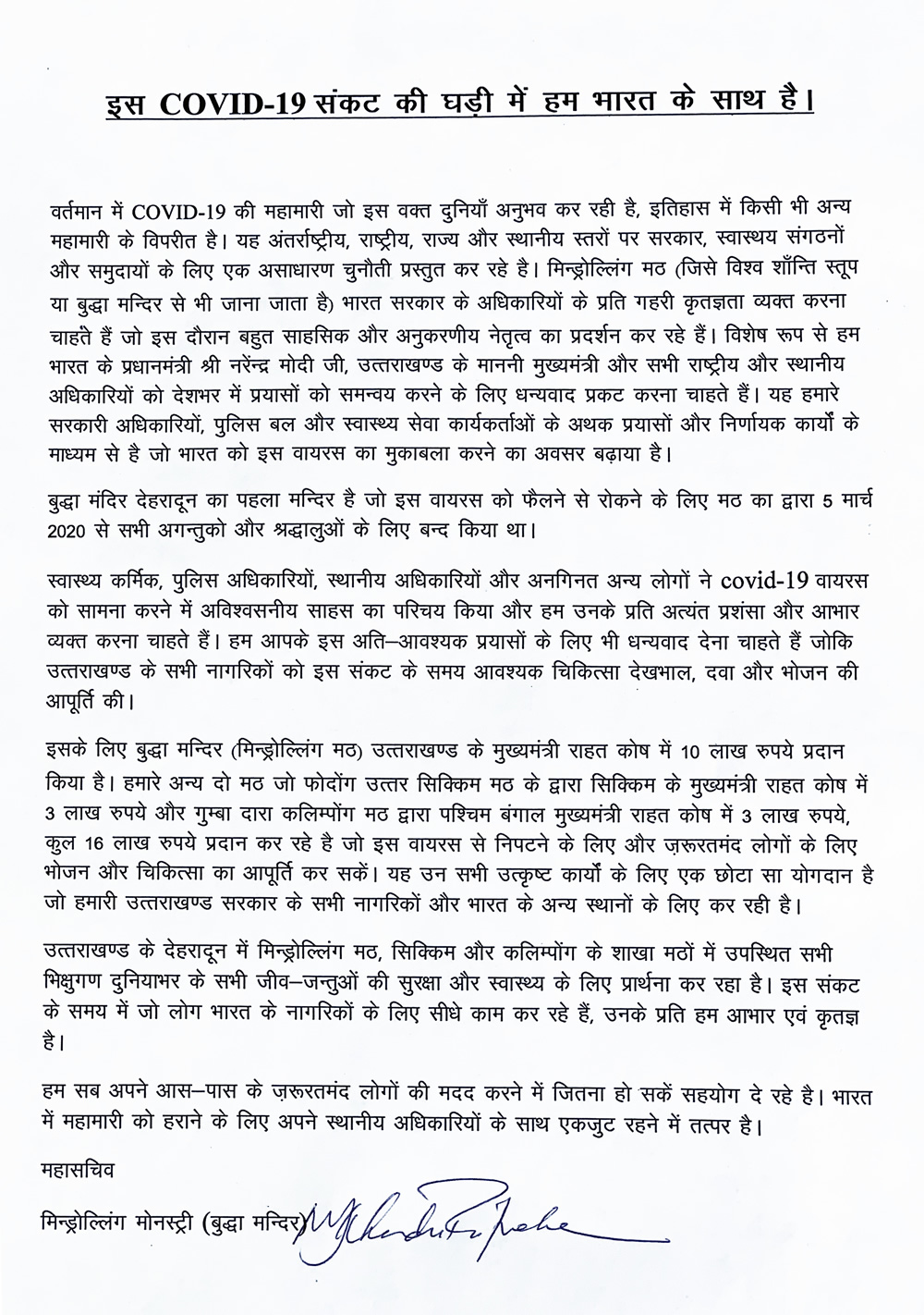 Mindrolling Monastery wishes to extend most sincere gratitude and thanks to all of these courageous individuals. As a small token of this gratitude and in order to support the relief efforts, Mindrolling has offered 1.6 million rupees to the relief funds established by the Honorable Chief Ministers of Uttarakhand, Sikkim and West Bengal to provide equipment and support to fight the pandemic during this time. In addition, Mindrolling Monastery is supporting the efforts to fight the pandemic by providing food and supplies to the local community and the daily wage workers during these difficult times. Everyone here at Mindrolling Monastery in Dehra Dun, Uttarakhand, and its branch monasteries in Sikkim and Kalimpong, West Bengal continues to pray for the health and well being of everyone throughout the world and in particular for all those who continue to work courageously to fight the pandemic.