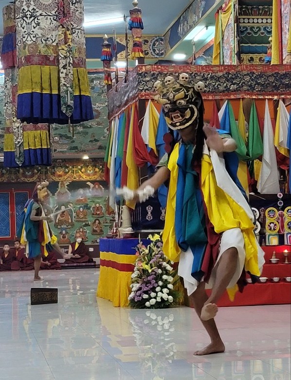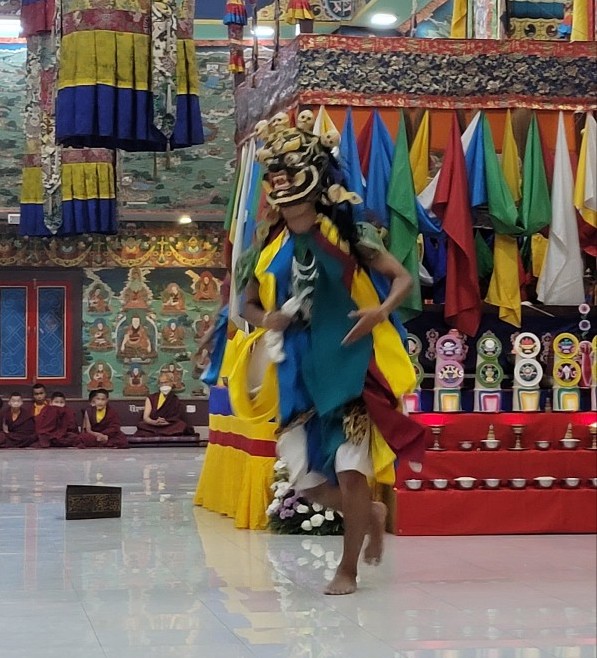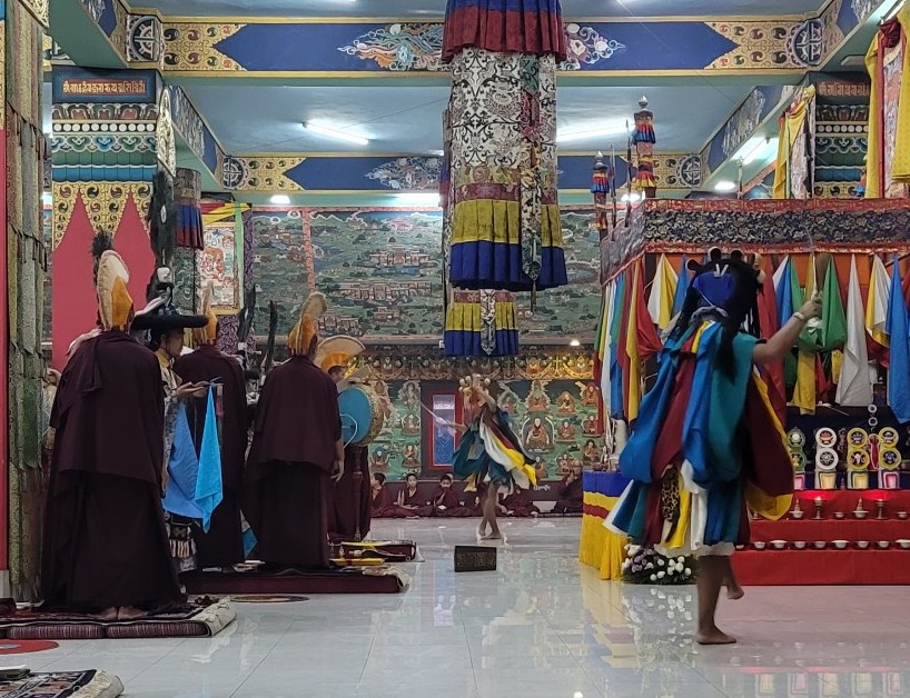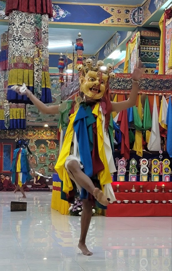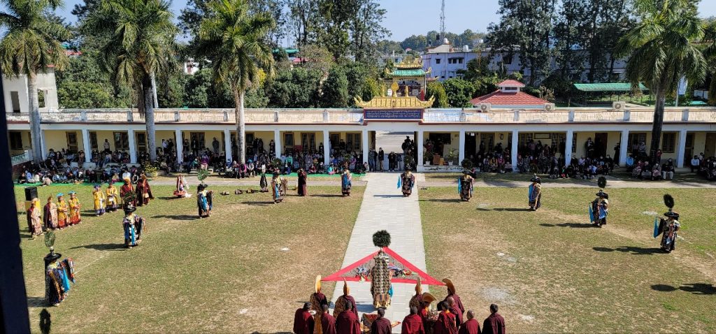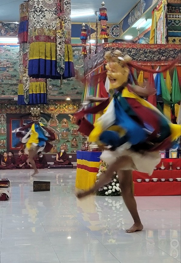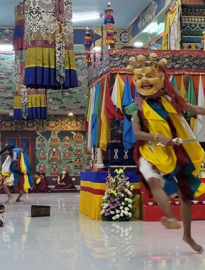 On February 23, 2022, the annual 7-day Yamantaka Shinje Drekjom drubchö began at Mindrolling Monastery. The Shinje Drekjom terma was discovered by the great terton and founder of Mindrolling, Chögyal Terdag Lingpa. This practice is done every year to dispel obstacles in the coming year and takes place from the 23rd lunar day of the 12th lunar month to the last day of the lunar year. This drubchö is known to be a most profound and powerful practice for dispelling obstacles and is filled with inconceivable blessings. On the 29th lunar day, the assembly performed the Zor Cham, or ritual dance, which is said to have great power to dispel obstacles for the world and especially for all who see it. For the first time in two years, the lay Tibetan community was able to attend the 29th day Zor Cham. It was a day of great joy as the community was able to gather again to benefit from this profound practice again after so long.