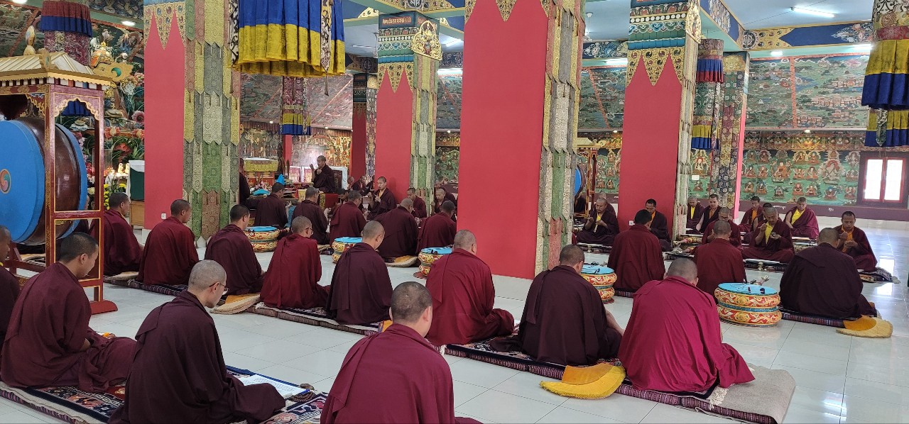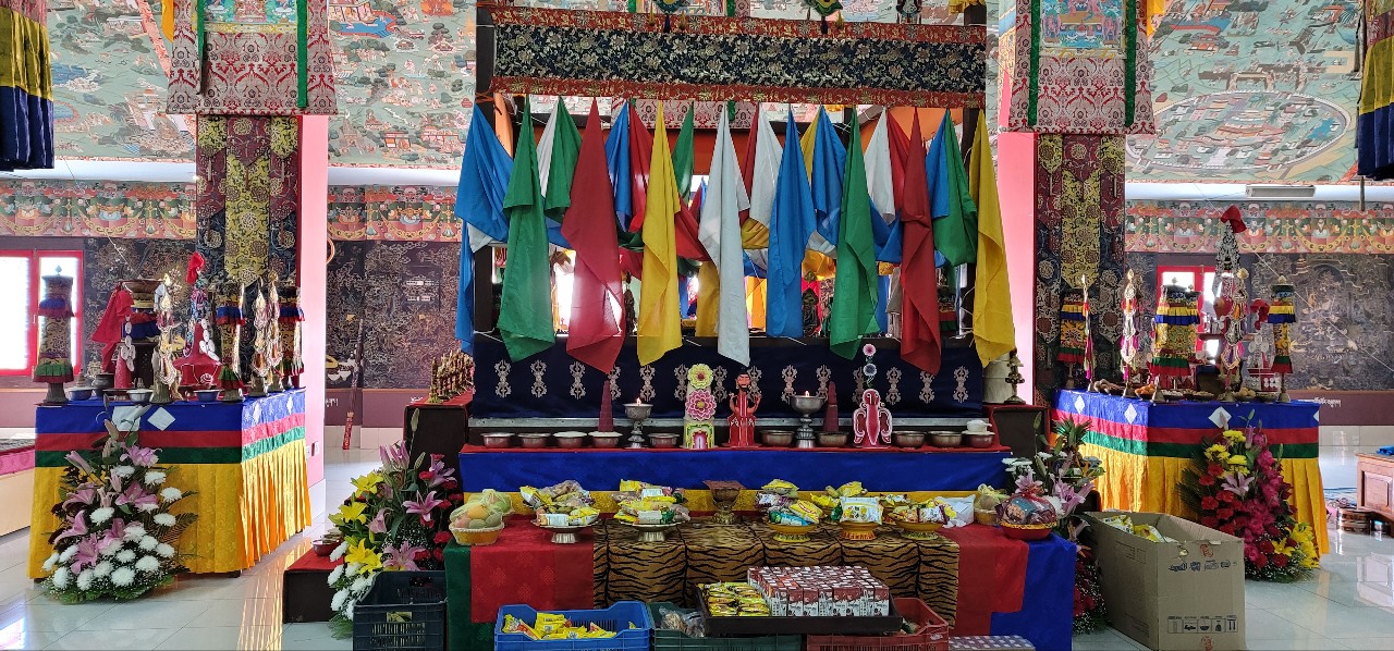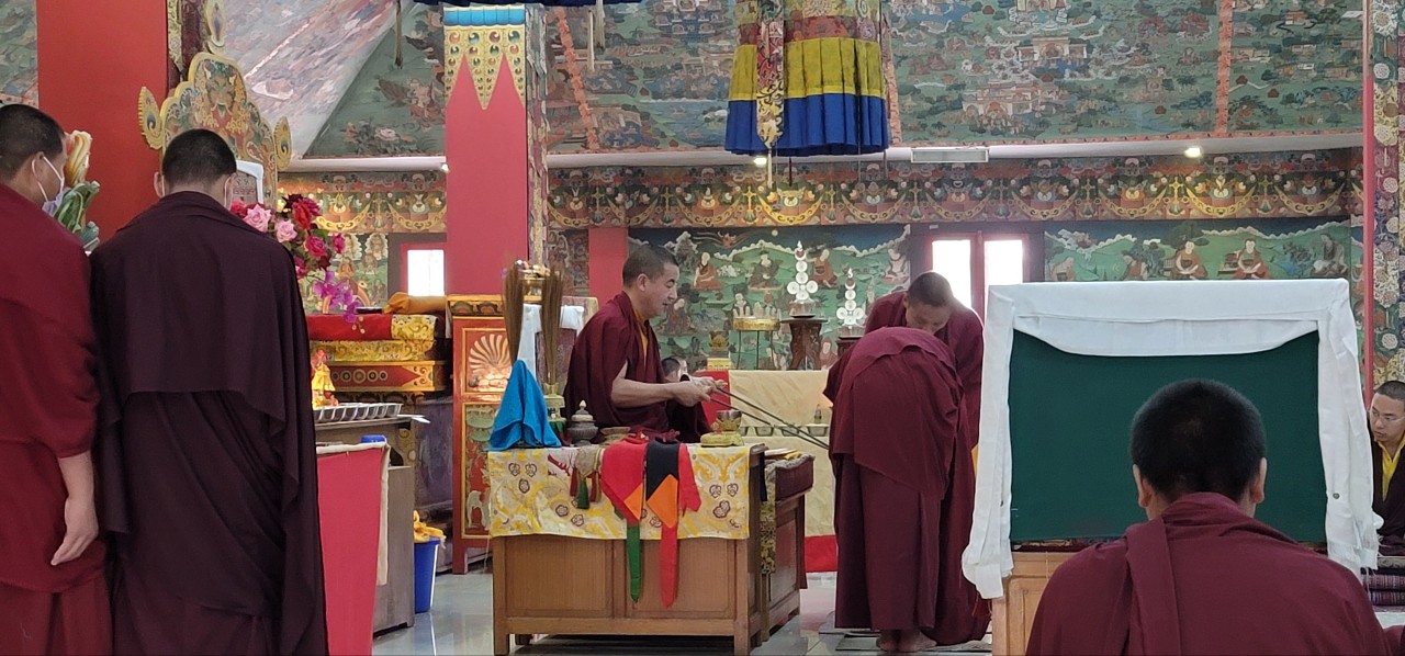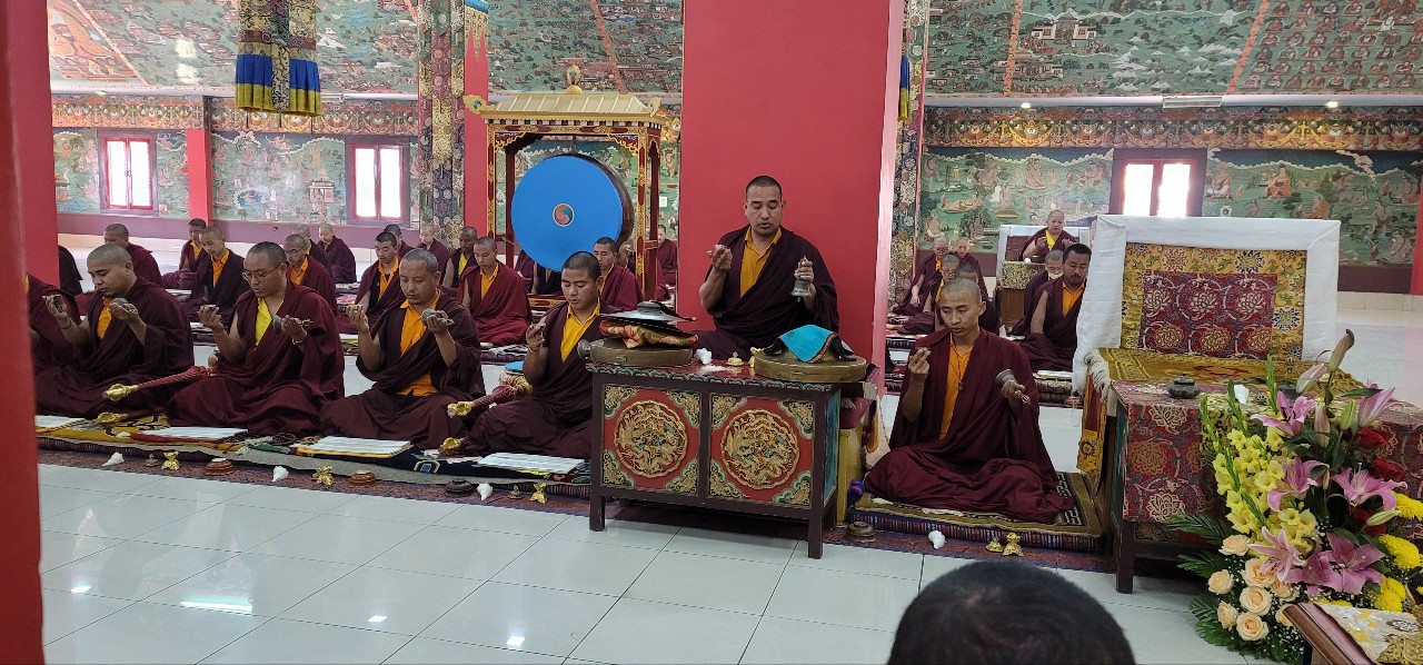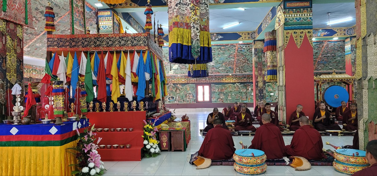 On March 26th, 2022, Mindrolling began the annual ten-day Kagyed Drubchen. This drubchen is of particular importance to the Mindrolling Sangha. This mahasadhana is based upon the Kagyed De-Sheg Du pa terma revealed by the great Tertön Nyang Ral Nyima Özer in the 12th century and later revived by Chögyal Terdag Lingpa. Before passing into Parinirvana, the master Terdag Lingpa instructed his students not to grieve, but instead to perform the great Kagyed Drubchen every year. In keeping with this great master’s instructions, Mindrolling performs the Kagyed Drubchen every year and it culminates on the anniversary of Chögyal Terdag Lingpa’s Parinirvana, the second day of the second lunar month (April 3rd, 2022).