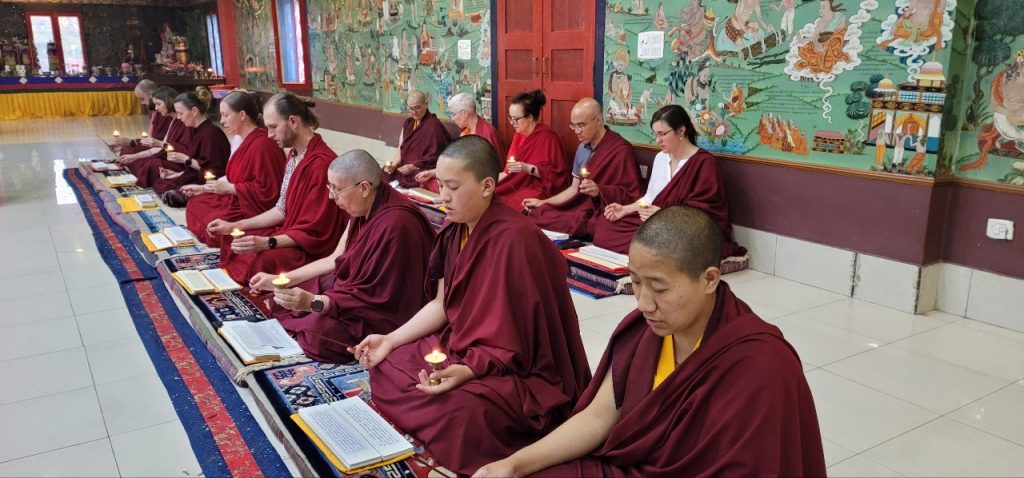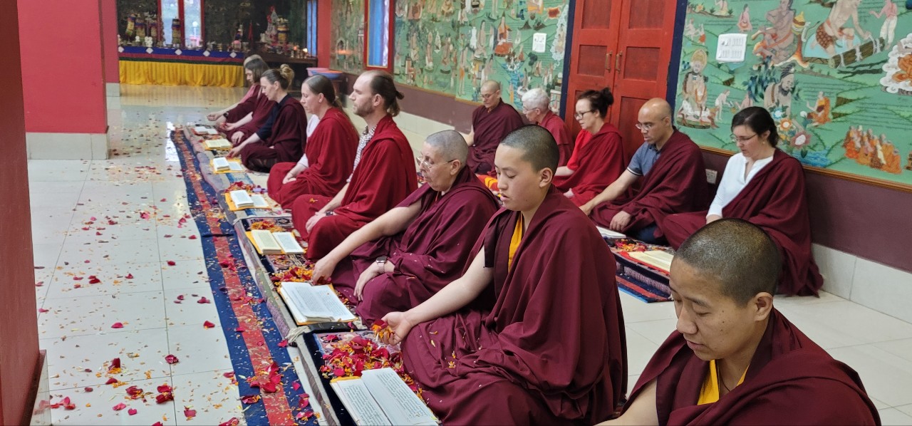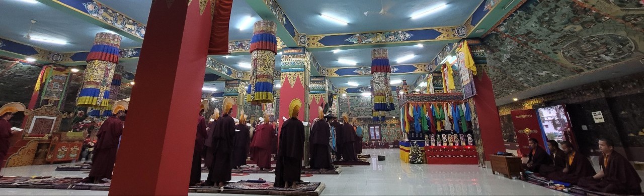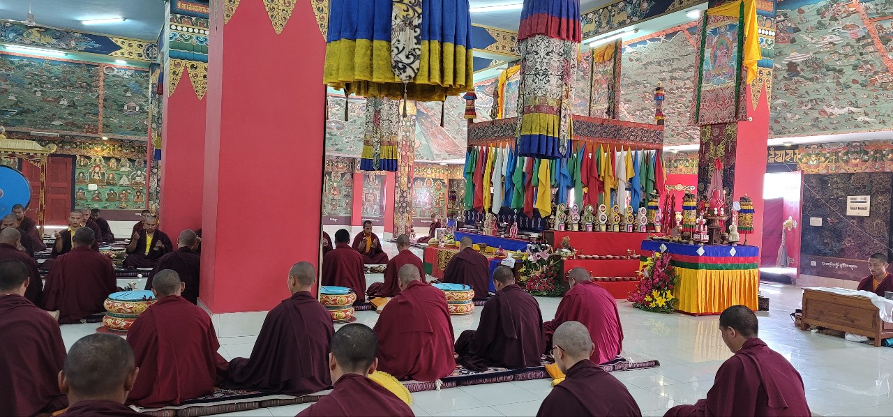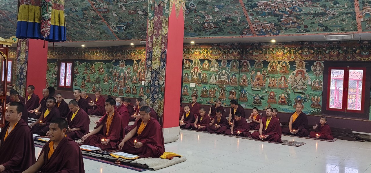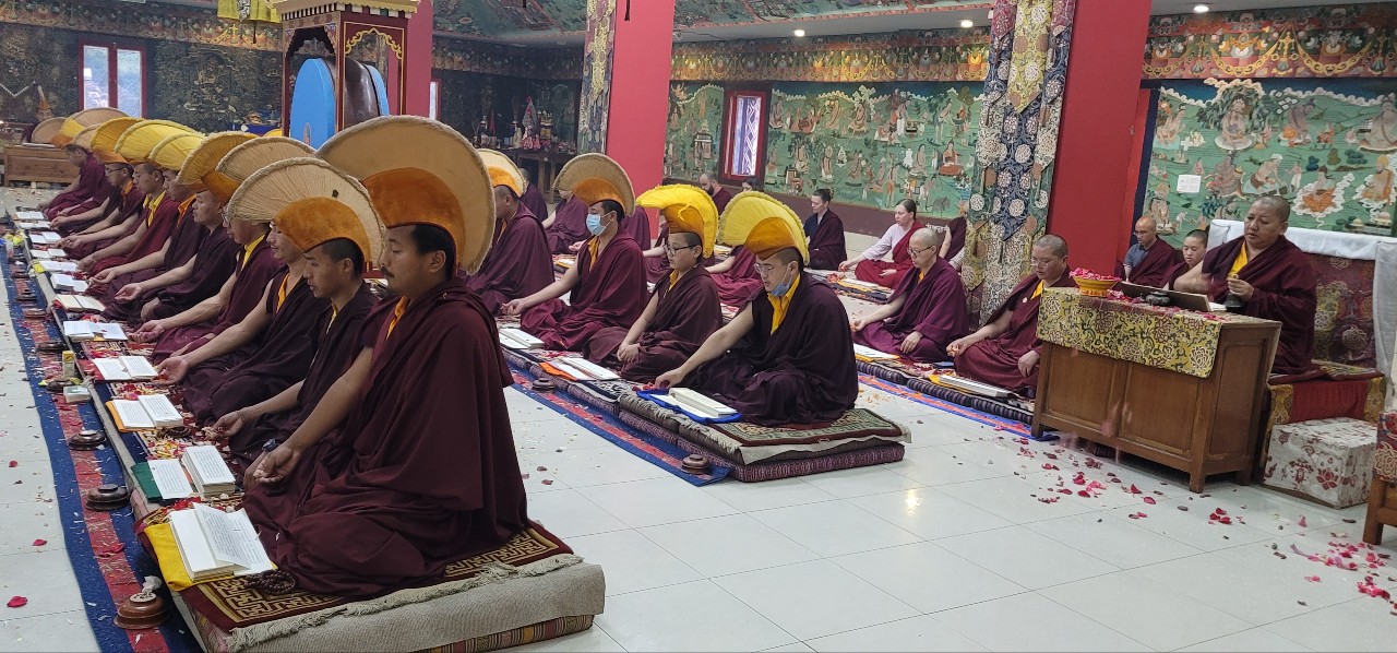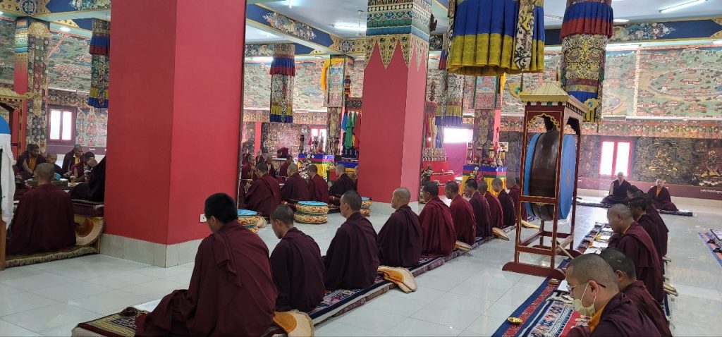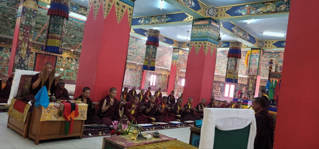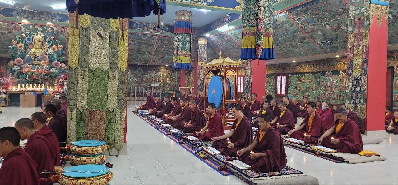 Following Losar, on Saturday, March 12th, 2022, Mindrolling Monastery began the great Thug Je Chenpo drubchen, or the Drubchen of the Great Compassionate One. This annual 7-day drubchen is performed every year in commemoration of the anniversary of the Parinirvana of Kyabje Minling Trichen. The Thug Je Chenpo terma was revealed by Chögyal Terdag Lingpa and it is considered to be especially beneficial during this era when merit and virtue are weak. Knowing that generation after generation of the Mindrolling lineage have manifested as the Great Compassionate One (Thug Je Chenpo) for the benefit of beings, each year the sangha of Mindrolling performs this profound mahasadhana with great joy and devotion and with the aspiration that the Dharma will continue to flourish and that the activities of our teachers will be as vast as the sky. The merit of this practice is dedicated to the benefit and liberation of all sentient beings and the continued flourishing of the Mindrolling lineage.