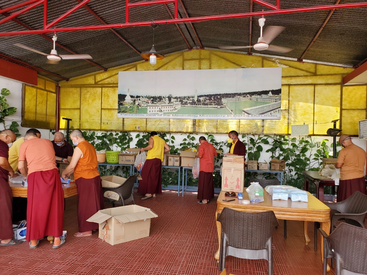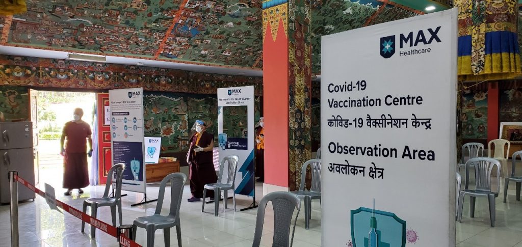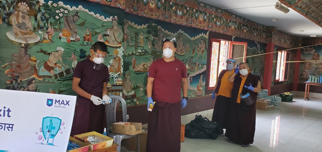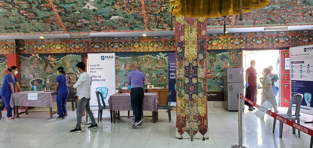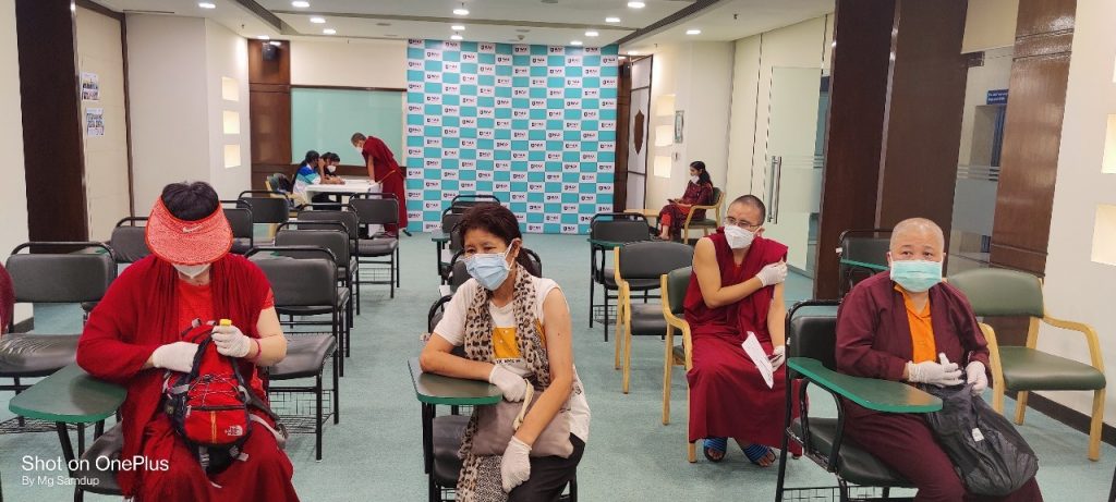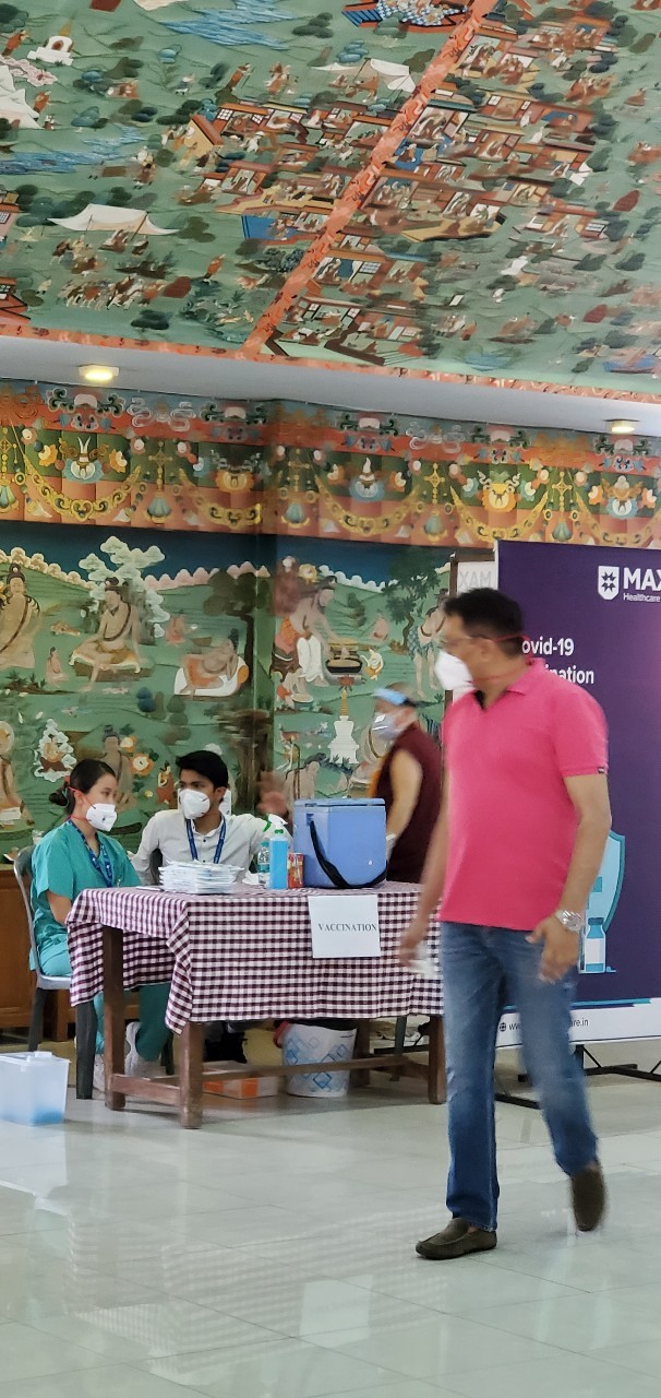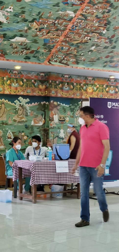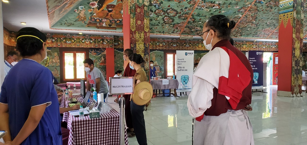 As India faced incredible challenges during the most recent wave of COVID-19, the administration team of Mindrolling Monastery worked tirelessly to protect the safety of the monks and the lay community. Facing such a crisis with shortages of so many needed supplies, the team did widespread testing, treated all those who tested positive and contained the spread of the virus using quarantines and contact tracing. After weeks of hard work, the spread of the virus within the Clement Town Tibetan Colony was contained and the safety of those in the colony has been successfully secured. Once the situation was controlled and the safety of the community had been secured, Mindrolling Monastery organized a huge vaccination effort to get the entire monastic community of Mindrolling and the Tibetan colony vaccinated. The clinic took place in the Guru Rinpoche shrine room of the stupa at Mindrolling Monastery.