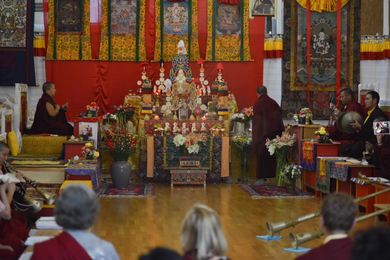 Following a flurry of activities in the summer and early autumn that included many sacred ceremonies in India and abroad, over 200 sangha members from around the world came to Oberlethe, Germany, on the 24th of October for an inspiring five-day drubchö of the Minling Dorsem. This first Mahasangha Gathering of Mindrolling International’s sangha was blessed with the presence of Jetsün Khandro Rinpoche, Minling Sangyum Kushog, Jetsün Kushog, Dungse Rinpoche, Jetsün Rinpoche, Ven. Tulku Ngawang Jigdral Kunga Rinpoche, Ven. Tulku Dakpa Rinpoche, Ven. Lama Thinley Gyaltsen, Ven. Löpon Namdrol la, Ven. Lama Riga la, Anila Choenyid and many other monks and nuns and resident teachers of the international Mindrolling sangha.